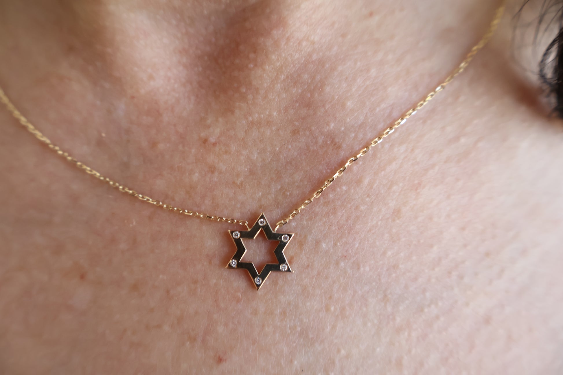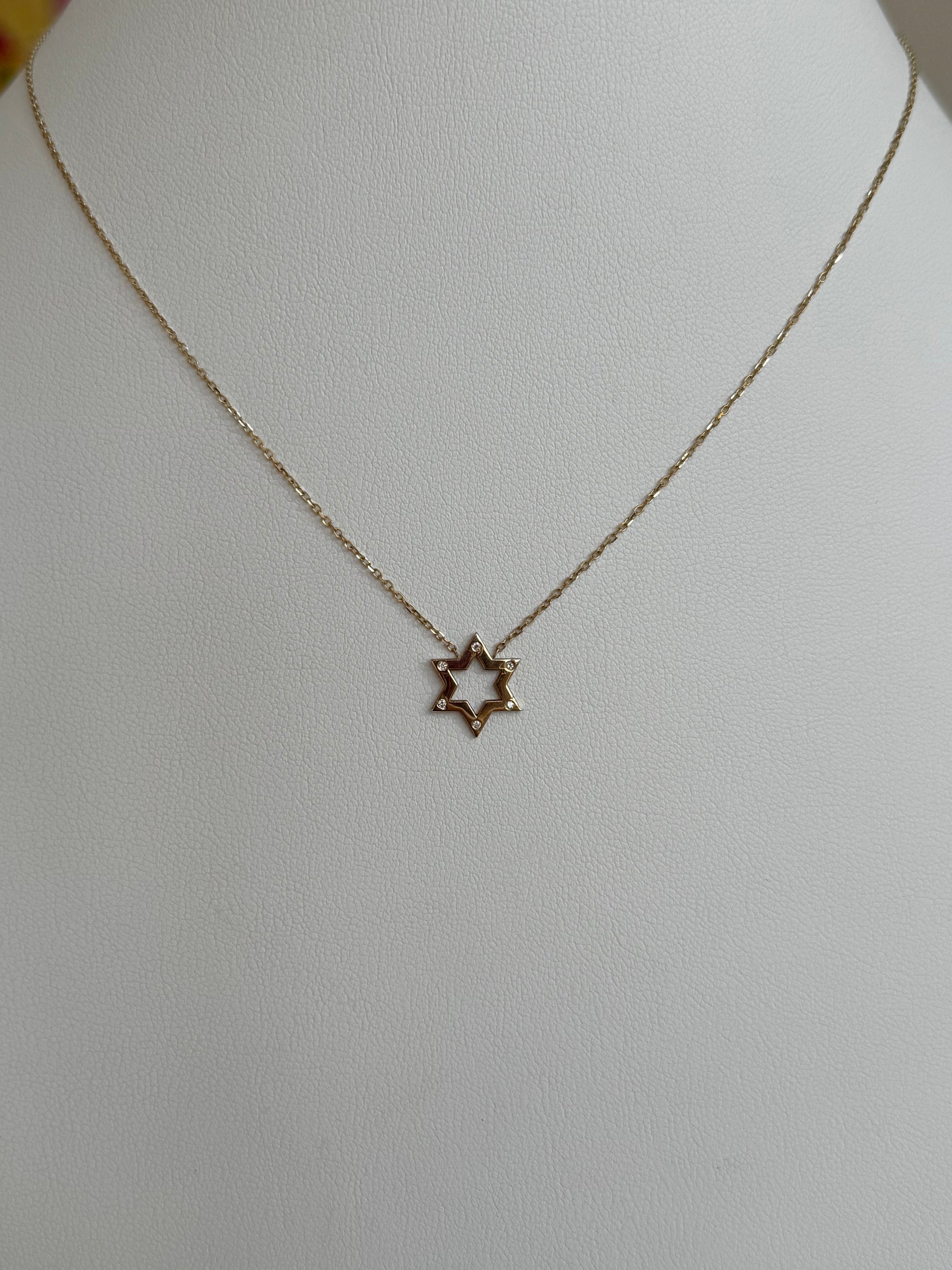 A hand made six pint star on a dainty chain. This beauty has a diamond on every point. It’s just perfect